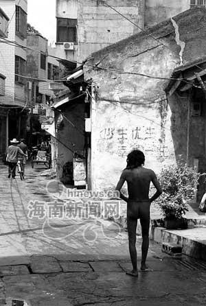 7月4日上午11點(diǎn)20分,記者采訪路過?谑腥齺喗,剛走到博愛街道辦三亞居委會門口,就聽到不遠(yuǎn)處傳出一聲女子的尖叫。記者循聲望去,只見一名年輕女子手上拿把傘,驚慌地從小巷跑出來。在她的身后,緊跟著一名赤身裸體的男人,披著篷亂的長發(fā)。見女子跑到人多的地方,追她的男子沒有跟出來,而是轉(zhuǎn)身朝三亞下街方向走去。記者正欲報警,請警方來控制追女人的赤裸瘋子,對方已跑得沒了影。