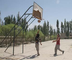 英吉沙縣艾古斯鄉(xiāng)的兩個(gè)維吾爾少年在記者的鏡頭下盡力展示自己的籃球天賦。