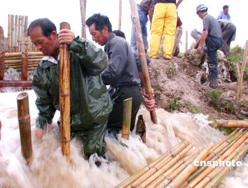 | 7月20日下午3時(shí)左右,因受5號(hào)臺(tái)風(fēng)“海棠”影響,浙江溫嶺濱海鎮(zhèn)團(tuán)結(jié)水系和金清水系交界的防洪堤,被沖開(kāi)3米多長(zhǎng)的決口,金清水系倒灌團(tuán)結(jié)水系,水位落差達(dá)1米多,水流洶涌。如不及時(shí)修復(fù)決口,濱海鎮(zhèn)五灣以東的5萬(wàn)多畝農(nóng)作物將面臨被淹沒(méi)的危險(xiǎn)。發(fā)現(xiàn)險(xiǎn)情后,該鎮(zhèn)立即組織一支30多人小分隊(duì)進(jìn)行搶險(xiǎn)堵缺,經(jīng)過(guò)4個(gè)多小時(shí)鏖戰(zhàn),防洪堤決口終于被堵上。作者:鄭玲富