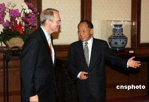 中國外交部長李肇星七月二十五日在北京釣魚臺(tái)國賓館會(huì)見并宴請(qǐng)前來出席朝核問題六方會(huì)談的美國國務(wù)院助理國務(wù)卿希爾。作者:毛建軍