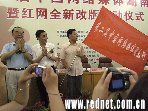 湖南省委副書記謝康生(右)、副省長許云昭(左)為采訪團(tuán)授旗(紅網(wǎng)圖片)