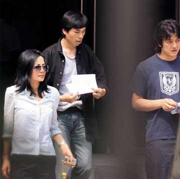王菲扎著馬尾,穿一件黑色T恤和一條時尚的乞丐牛仔褲,戴一副超大號的黑色墨鏡,李亞鵬穿米黃色短袖襯衣、休閑褲。從兩人下車一直到在結(jié)婚登記處辦完手續(xù),李亞偉不離左右,而穿淺藍色T恤的男士則用DV機進行跟拍。