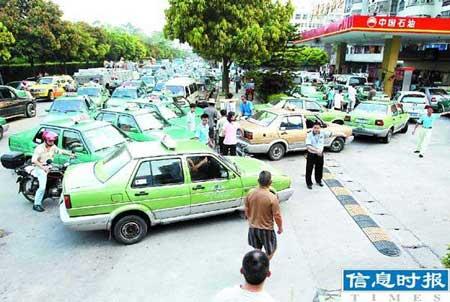 在普遍“貧油”的狀況下,也有例外情況。在天府路新力加油站,記者見到了排隊加90#油的出租車長龍。由于等待加油的車太多,天府路一時路塞。而花地大道廣中加油站自稱有足夠的油可加。