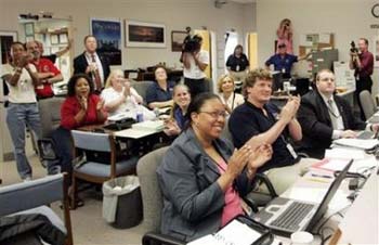 美國宇航局地面控制人員鼓掌祝賀“發(fā)現(xiàn)”號順利著陸