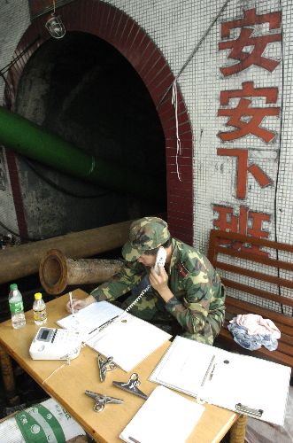 廣東興寧透水礦井十日加緊進(jìn)行抽水作業(yè)。需要三十個(gè)小時(shí)才能裝好的大功率潛水泵,經(jīng)工作人員的連續(xù)奮戰(zhàn),提前十四小時(shí)安裝完畢,于十日凌晨一次啟動(dòng)成功,目前井下水位以每小時(shí)一米的速度下降。圖為大功率潛水泵供電的大電纜每隔一段時(shí)間就要用水淋灑降溫。作者:羅仰明