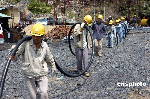 十一日,廣東興寧大興透水煤礦再加裝從河南省調(diào)來的九百千瓦大功率潛水泵,以加快井下排水進(jìn)度。圖為搶險人員在為大功率水泵鋪設(shè)電纜。作者:羅仰明
