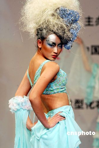 2006中國發(fā)型化妝潮流趨勢發(fā)布會8月14日在北京舉行,模特展示的化妝造型以“歡顔、影舞、暗香、幻想”為主題,展現(xiàn)女性的不同氣質。一年一度的潮流趨勢發(fā)布由中國發(fā)型化妝藝術研創(chuàng)中心創(chuàng)作演出。作者:張宇