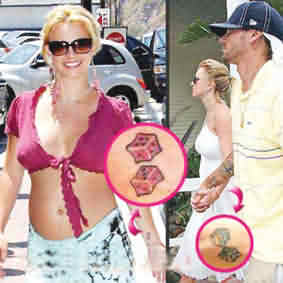 2004年5月,小甜甜布蘭妮和現(xiàn)在的老公凱文·費(fèi)德林同去愛爾蘭首都都柏林,兩人都在手腕上文了一對骰子圖案,一個(gè)紅色、一個(gè)藍(lán)色,這顯然是個(gè)幸運(yùn)的文身,一周后在返回美國的飛機(jī)上,他們訂婚了。