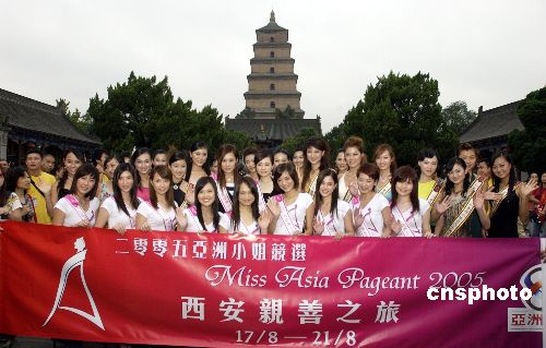 8月17日,參加西安“2005亞洲小姐總決賽”的20位內(nèi)地妙齡佳麗以及來(lái)自香港的12位選手和上屆冠軍呂晶晶、馮梓瑩一行抵達(dá)古城西安,并游覽了久負(fù)盛名的大慈恩寺,吸引了眾多中外游客。作者:侯智