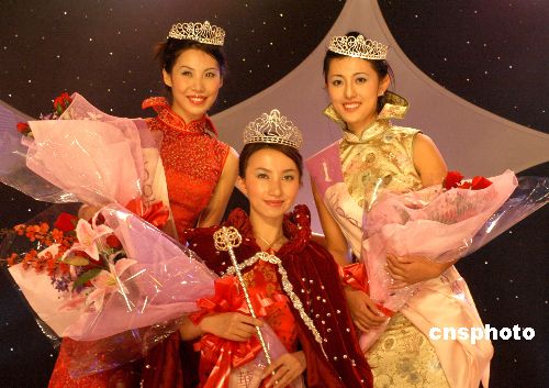 二00五年度紐約華裔小姐競選決賽八月二十一日在新澤西州的大西洋城舉行。出生于北京、二十一歲的王倩(中)奪得冠軍,季白莎(右)獲亞軍,陳珊(左)獲季軍。作者:龔文謨
