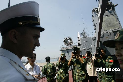 八月二十二日,中國部分媒體被中俄軍事演習俄軍方邀請,參觀采訪此次參加演習的俄羅斯反潛艦,這艘?吭谇鄭u港的艦艇正整裝待發(fā),明日將起航參加海上封鎖演習。圖為中國軍方記者對一位在艦上值勤的俄海軍軍官產生濃厚興趣。作者:王麗南