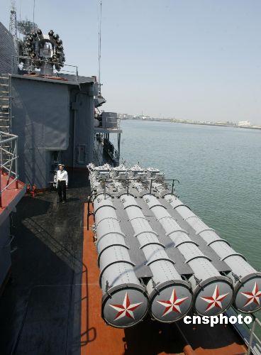 八月二十二日,中國部分媒體被俄軍方邀請,參觀采訪此次參加演習(xí)的俄羅斯反潛艦,這艘?吭谇鄭u港的艦艇正整裝待發(fā),明日將起航參加海上封鎖演習(xí)。圖為反潛艦的一角。作者:王麗南