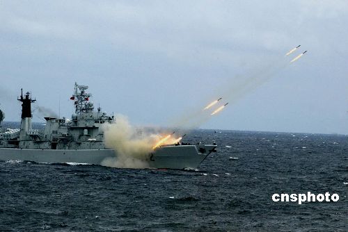 八月二十三日,“和平使命-2005”中俄聯(lián)合軍事演習(xí)第三階段——實(shí)施交戰(zhàn)的海上封鎖演練在中國(guó)山東半島及其附近海域開始。圖為中國(guó)驅(qū)逐艦發(fā)現(xiàn)目標(biāo)后發(fā)射火箭彈。作者:王麗南
