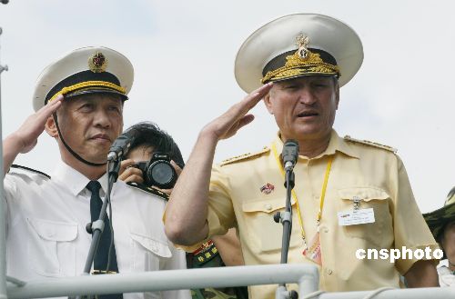 “和平使命-2005”中俄聯(lián)合軍事演習(xí)第三階段8月23日在中國山東半島及其附近海域開始。圖為俄羅斯太平洋艦隊司令費奧多羅夫(右)與中國海軍北海艦隊司令員張展南向受閱艦艇行軍禮。作者:王麗南