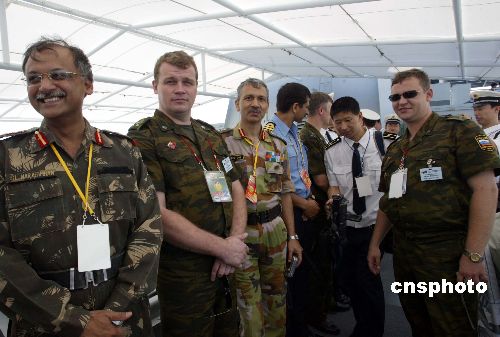 八月二十三日,上海合作組織觀察員國觀察員、俄羅斯軍官等,乘艦艇觀摩在中國山東半島及其附近海域進行的“和平使命——2005”中俄聯(lián)合軍事演習(xí)。作者:王麗南