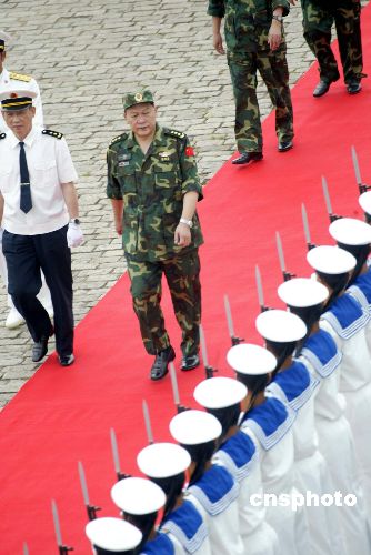 “和平使命-2005”中俄聯(lián)合軍事演習(xí)第三階段8月23日在中國山東半島及其附近海域開始。圖為中國人民解放軍總參謀長梁光烈在演習(xí)開始時檢閱海軍官兵。作者:王麗南