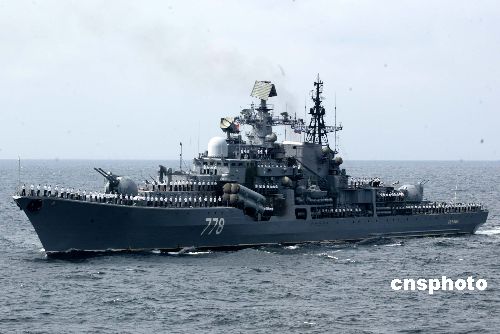 “和平使命-2005”中俄聯(lián)合軍事演習(xí)第三階段8月23日在中國山東半島及其附近海域開始。圖為參加演習(xí)的俄艦艇,接受聯(lián)合導(dǎo)演部檢閱。作者:王麗南