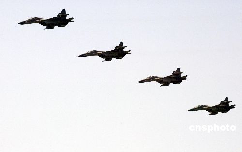 中俄聯(lián)合軍事演習海上封鎖演練中,蘇-27飛機以編隊形式飛過戰(zhàn)區(qū),與艦艇協(xié)同作戰(zhàn)。作者:王麗南
