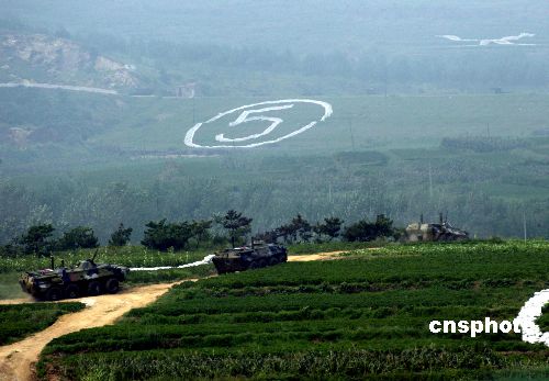 八月二十四日,“和平使命—2005”中俄聯(lián)合軍事演習第三階段兩棲登陸作戰(zhàn)實兵演練在山東半島展開。圖為參加兩棲登陸作戰(zhàn)實兵演練的裝甲運兵車登陸后,向縱深挺進。作者:王麗南