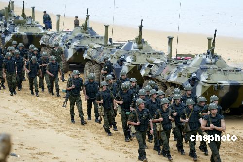 八月二十四日,山東半島雨水不斷,“和平使命—2005”中俄聯(lián)合軍事演習(xí)兩棲登陸作戰(zhàn)實(shí)兵演練如期進(jìn)行。圖為完成登陸任務(wù)后的俄羅斯陸戰(zhàn)隊員,在海邊等待裝船返航。作者:王麗南