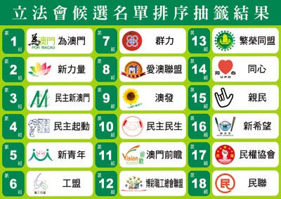 澳門公職局于二十四日下午三時半在公共行政大樓演講廳抽簽,為體現(xiàn)公平原則,抽簽過程完全由候選組別代表操作。由于間選四個選舉組別各有一份候選名單,不須抽簽。