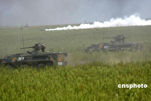 8月25日,參加強制隔離實兵演習的中方部隊裝甲戰(zhàn)車在煙障掩護下向目標發(fā)起攻擊。當日上午,“和平使命——2005”中俄聯(lián)合軍事演習最后一個戰(zhàn)術行動課目——強制隔離作戰(zhàn)演練在濟南軍區(qū)濰北靶場舉行。作者:王麗南