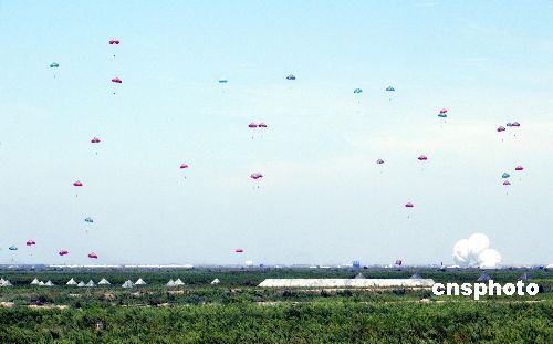 “和平使命——2005”中俄聯(lián)合軍事演習(xí)強(qiáng)制隔離演練8月25日在山東半島舉行。圖為中國(guó)空降傘兵跳傘,彩色傘花飄滿天空。作者:王麗南