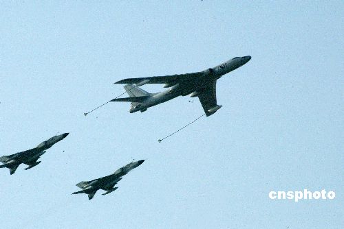 “和平使命-2005”中俄聯(lián)合軍事演習8月25日下午在山東濰北地區(qū)結(jié)束。在當日舉行的閱兵式上,中國空中加油機編隊模擬空中加油。作者:王麗南