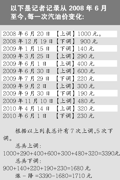 在帖子里,網(wǎng)友列出了從2008年6月至2010年6月,每一次國(guó)家發(fā)改委對(duì)油價(jià)的調(diào)整,得出結(jié)論是漲7次,降4次,每噸汽油的漲幅總額為3390元,而每噸汽油的降幅總額為760元,于是得出計(jì)算結(jié)論:2年前的油價(jià)是74美元,現(xiàn)在還是74美元,可是汽油價(jià)卻漲了2630元1噸。