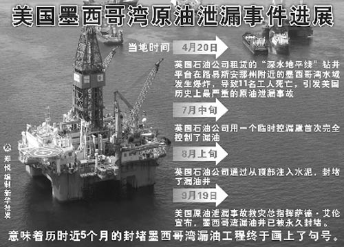 4月20日,由英國石油公司租賃的“深水地平線”鉆井平臺在美國墨西哥灣水域爆炸沉沒,造成了美國有史以來最嚴重的原油泄漏事故。此后,英國石油公司曾采取多種辦法封堵漏油,但效果一直不理想。