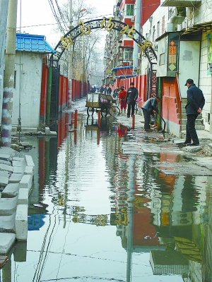 據(jù)居民介紹,西馬場(chǎng)北里只有這一條東西走向的胡同,居民出門、購物都必須走這條路。可現(xiàn)在路面每天汩汩往外冒臭水,人們只好用方磚沿著胡同北面鋪了一條窄路勉強(qiáng)通行,而現(xiàn)在那些方磚也被臭水淹沒了,居民通行更加困難。