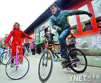 只能通過一輛小轎車的五道營胡同,幾十名“老外”耍起車技,昨天(7日)下午,來自美國、德國、英國、法國等十六個(gè)國家的五十余名外國朋友用自行車表演,與“胡同鄰居”共同倡導(dǎo)“綠色出行、低碳生活”主題。