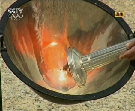 在希臘奧委會(huì)主席艾東尼斯向劉淇贈(zèng)送奧運(yùn)圣火的火種罐后,奧運(yùn)圣火取火儀式于當(dāng)?shù)貢r(shí)間十一時(shí)四十分在赫拉神廟前進(jìn)行。八分鐘后,擔(dān)任最高女祭司的希臘著名演員瑪利亞·娜芙普利都通過(guò)凹面鏡點(diǎn)燃手中的取火火炬,北京奧運(yùn)圣火采集獲得圓滿成功!