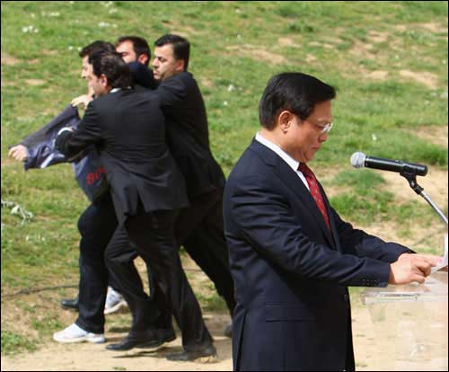 上午十一點,圣火采集儀式正式開始。陽光明媚,暖風(fēng)習(xí)習(xí),古競技場內(nèi)綠草茵茵,春花爛漫,一切都顯得生機(jī)盎然,現(xiàn)場氣氛神圣而祥和。儀式進(jìn)行了十幾分鐘,北京奧組委主席劉淇上前開始發(fā)表講話,這時,記者看見來賓席上突然躥出一個人,他奔向劉淇,在劉淇身旁展開一個橫幅,另有兩個顯然是他同伙的人也加入進(jìn)來發(fā)難。但他們迅即被在場的希臘警察制服,并被帶離現(xiàn)場。在這一不到兩分鐘的過程中,劉淇繼續(xù)沉穩(wěn)莊嚴(yán)地發(fā)表講話,未受到任何影響。當(dāng)劉淇主席講話結(jié)束和會場傳來北京奧運(yùn)圣火在赫拉神廟前已點燃的消息時,整個現(xiàn)場響起了雷鳴般的掌聲,在場的人們用這種方式表達(dá)了對奧運(yùn)的熱愛和對北京奧運(yùn)會的祝福。整個儀式按既定程序進(jìn)行,那場小鬧劇也成了全世界愛好和平、熱愛奧運(yùn)的人們的笑柄。