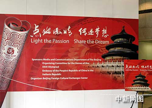 當?shù)貢r間3月29日,“點燃激情、傳遞夢想”北京奧運會火炬?zhèn)鬟f主題圖片展覽,在希臘奧委會辦公樓一層大廳舉辦。 中新社記者 王歡
