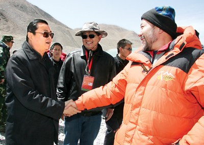 3月30日,在日喀則檢查指導(dǎo)維護(hù)穩(wěn)定和邊境管理工作的自治區(qū)黨委副書記、自治區(qū)常務(wù)副主席郝鵬,公安部副部長張新楓,帶領(lǐng)工作組一行專程前往珠峰大本營,檢查北京奧運(yùn)會火炬登頂珠峰的安全保障工作情況。