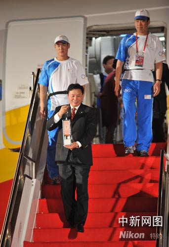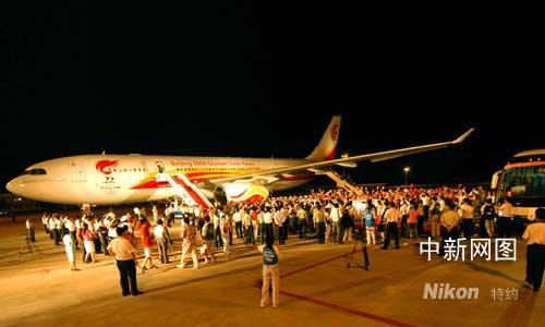三日晚十時三十二分,搭載北京奧運(yùn)圣火的“奧運(yùn)圣火號”平穩(wěn)地降落在海南三亞鳳凰機(jī)場,北京奧運(yùn)圣火抵達(dá)“和諧之旅”內(nèi)地傳遞的第一站——海南三亞。徐勤濤 攝