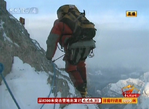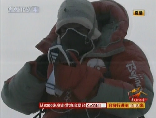 中國登山隊奧運圣火登頂珠峰突擊隊8日凌晨向珠峰峰頂發(fā)起沖擊。圖為電視截圖。