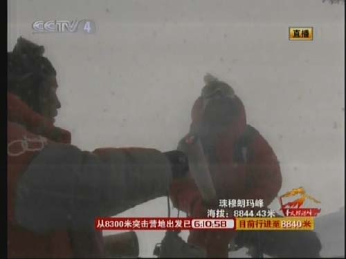圖:登山隊(duì)員用引火棒引燃珠峰傳遞首棒