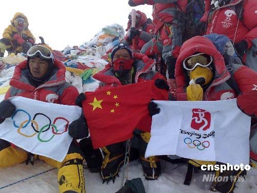 5月8日,北京奧運圣火珠峰傳遞登山隊成功登頂珠穆朗瑪峰。這是登山隊員在峰頂展示“祥云”火炬、火種燈、中國國旗、奧運五環(huán)旗和北京奧運會會徽旗。中新社發(fā) 阿旺扎西 攝