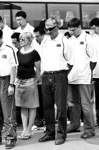 2008年5月19日下午14點(diǎn)28分,北京。中國(guó)男籃和其他備戰(zhàn)北京奧運(yùn)會(huì)的體育健兒一起,在國(guó)家體育總局訓(xùn)練局西院,在警報(bào)聲和汽車?guó)Q笛聲中,為“5.12”汶川大地震中的遇難者默哀3分鐘,以表達(dá)他們對(duì)遇難者的哀思。