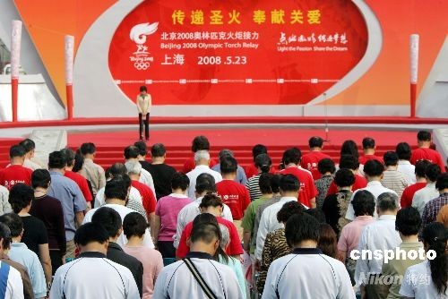 5月23日,北京奧運圣火在上海開始傳遞。在火炬?zhèn)鬟f起跑儀式上,所有在場人員默哀一分鐘,向四川地震遇難者致哀。 中新社發(fā) 湯彥俊 攝