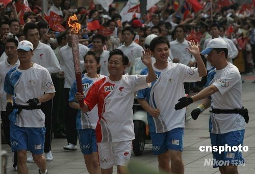 五月二十三日,中國乒乓名將姚振緒在上海繁華的南京路傳遞奧運火炬,受到上海市民歡迎。 中新社發(fā) 潘索菲 攝