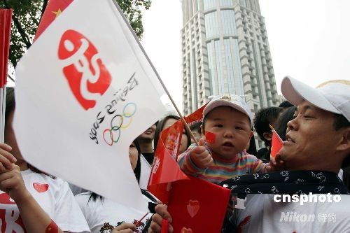 五月二十三日,奧運(yùn)火炬開始上海站傳遞,未滿周歲的上海幼童也加入上海市民迎接圣火的行列。 中新社發(fā) 潘索菲 攝