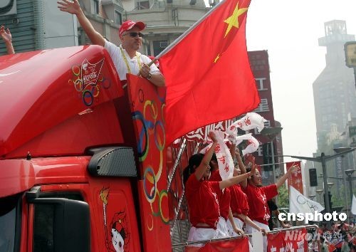 五月二十三日,奧運(yùn)圣火在上海傳遞,老外在奧運(yùn)花車上振臂為北京奧運(yùn)加油。 中新社發(fā) 潘索菲 攝
