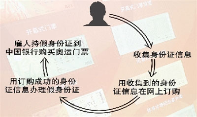 5月13日,在中國(guó)職工之家內(nèi)的中國(guó)銀行,兩名男子持假身份證購(gòu)買奧運(yùn)門票。警方將兩人帶走審訊后,成功搗毀了一個(gè)搜集身份證信息制造假證,網(wǎng)上訂票后高價(jià)倒賣的團(tuán)伙。該團(tuán)伙的奧運(yùn)發(fā)財(cái)夢(mèng),因假證被識(shí)破而破滅。