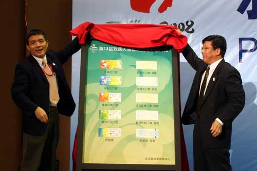 北京奧運票務(wù)中心主任朱炎、副主任于喜來揭曉北京殘奧會門票票樣。