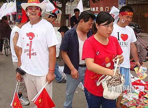 記者上午在運(yùn)城的街頭看到,各家商戶門面都懸掛奧運(yùn)彩旗,出租車、三輪車、摩托車等都自發(fā)的在車頭車尾插上彩旗。印有各色奧運(yùn)標(biāo)志圖案的文化衫火了運(yùn)城的一條街。