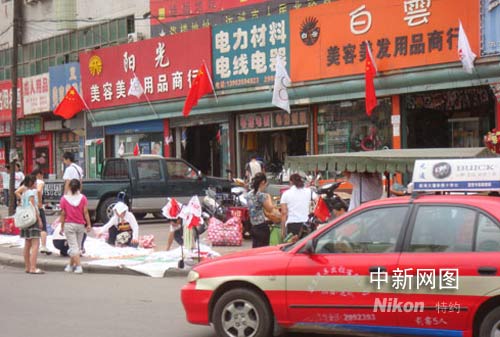 運(yùn)城街頭各家商戶門面都懸掛奧運(yùn)彩旗。作者 長年