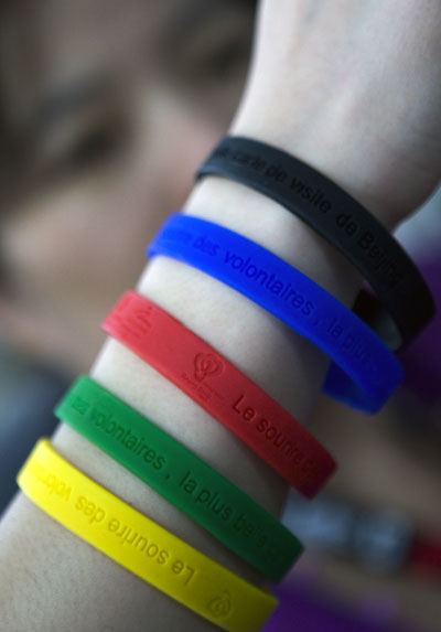 在今天上午的北京奧運(yùn)會(huì)、殘奧會(huì)京外、境外賽會(huì)志愿者工作會(huì)議上,“微笑圈”法文國(guó)際版被發(fā)布,它由奧運(yùn)五環(huán)顏色組成,外側(cè)印有法文“Le sourire des volontaires,la plus belle carte de visite de Beijing”,據(jù)悉,該文字翻譯稱中文就是“志愿者的微笑是北京最好的名片”的,內(nèi)側(cè)印有唯一的編號(hào)。